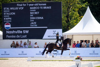 Ons fokproduct Nashville SW (Secret x Jazz x Farrington) is tijdens het WK Jonge Dressuurpaarden in Verden 4e geworden bij de 7e jarigen. Wat een wereldprestatie van deze goedgekeurde KWPN hengst met zijn amazone Femke de Laat.